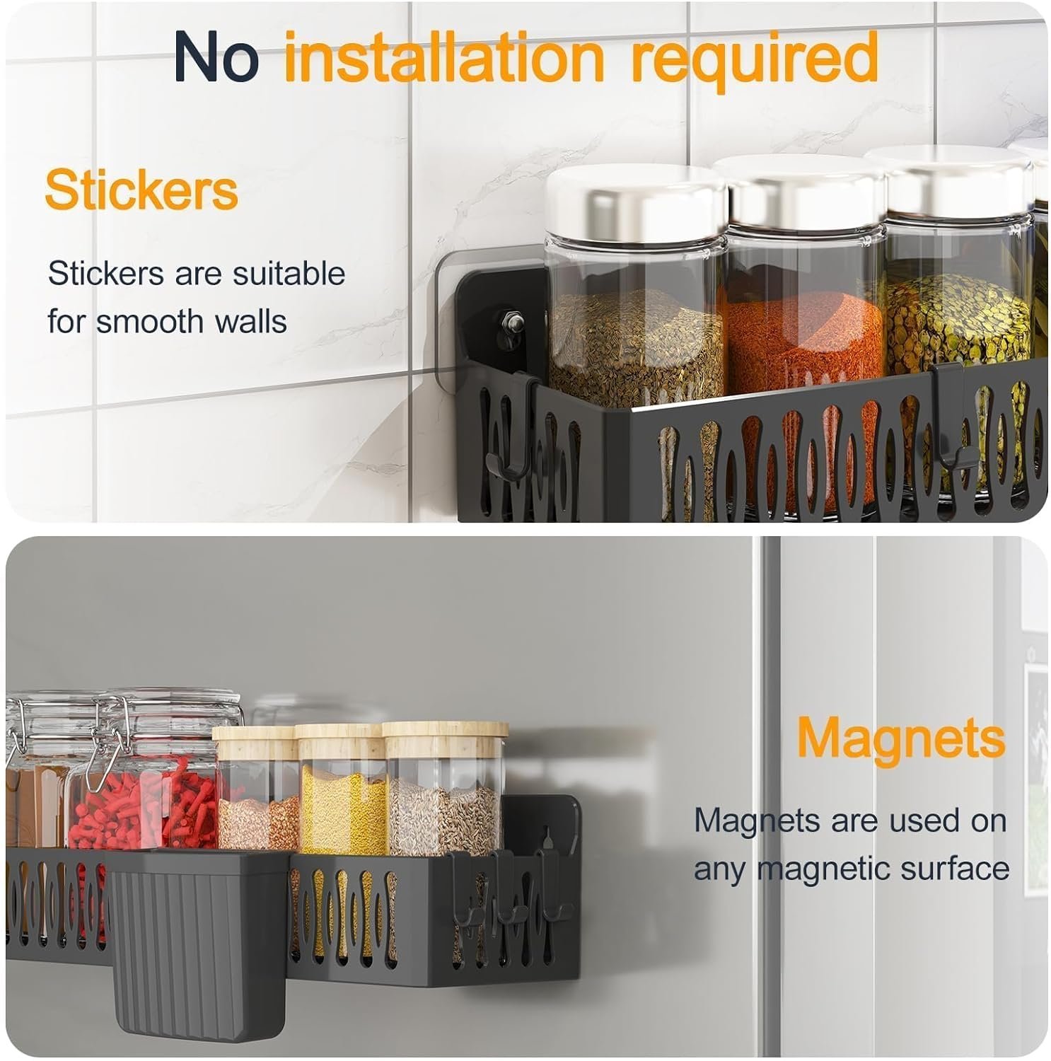 - 【Stronger Magnet-Pretty Stable】The magnetic seasoning rack is made of high-quality materials, and each refrigerator magnet organizer can hold up to 11 pounds without sliding over time. The magnetic spice rack has very strong grip, allowing you to organization and storage kitchen supplies with confidence.